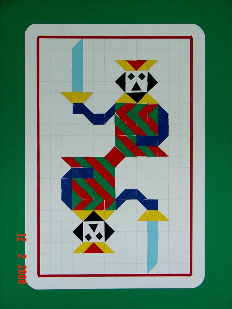 Τα τελικά σχέδια που επιλέχτηκαν ήταν δύο απεικονίσεις πολύχρωμων καλειδοσκοπίων, μιας ασπρόμαυρης χιονονυφάδας και ενός τραπουλόχαρτου. Και οι τέσσερις προτάσεις ήταν εξίσου δύσκολες και απαιτούσαν προσεκτική και πολύωρη δουλειά. Όμως τα καταφέραμε! Τα αποτελέσματα αυτών των προσπαθειών ήταν εξαιρετικά. Δημιουργήθηκαν 4 εντυπωσιακές εικόνες, φτιαγμένες με την τεχνική του κολλάζ έχοντας όμως ως βάση τη συμμετρία, είτε την κεντρική είτε την αξονική.